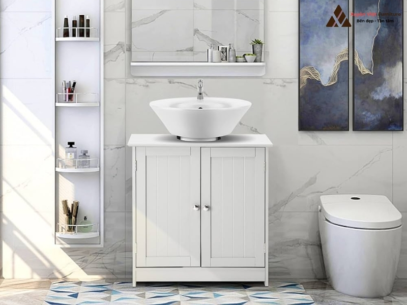 Phần dưới tủ, người dùng cũng có thể đặt các vật dụng khác thoải mái. Khi sử dụng kệ Lavabo treo tường, gia chủ có thể lựa chọn lắp tại nhiều vị trí, đặc biệt là góc phòng giúp tối ưu thêm nhiều diện tích.