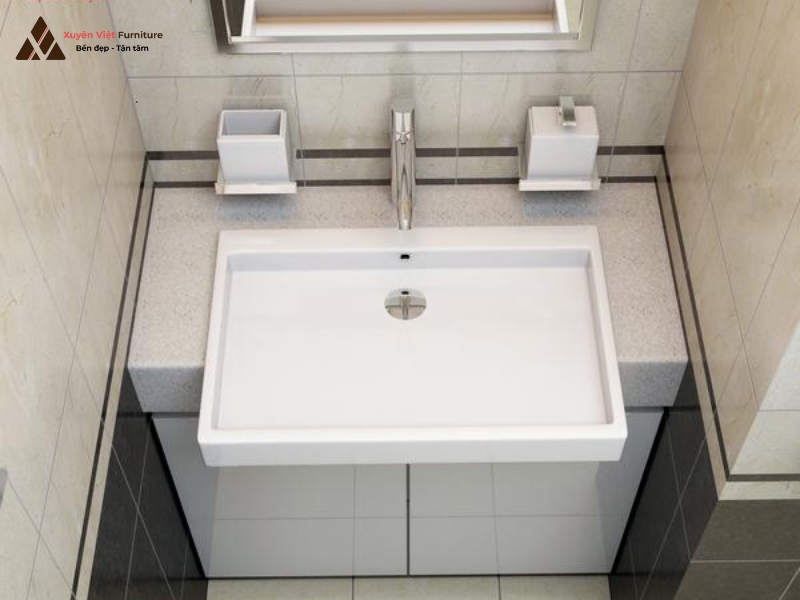 Mẫu tủ Lavabo bằng nhựa giả gỗ đẹp mắt, mặt đá ốp chắc chắn, dễ vệ sinh tạo sự tiện lợi cho người dùng