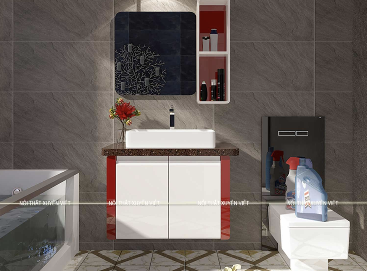 Tủ lavabo tông trắng, viền đỏ nổi bật