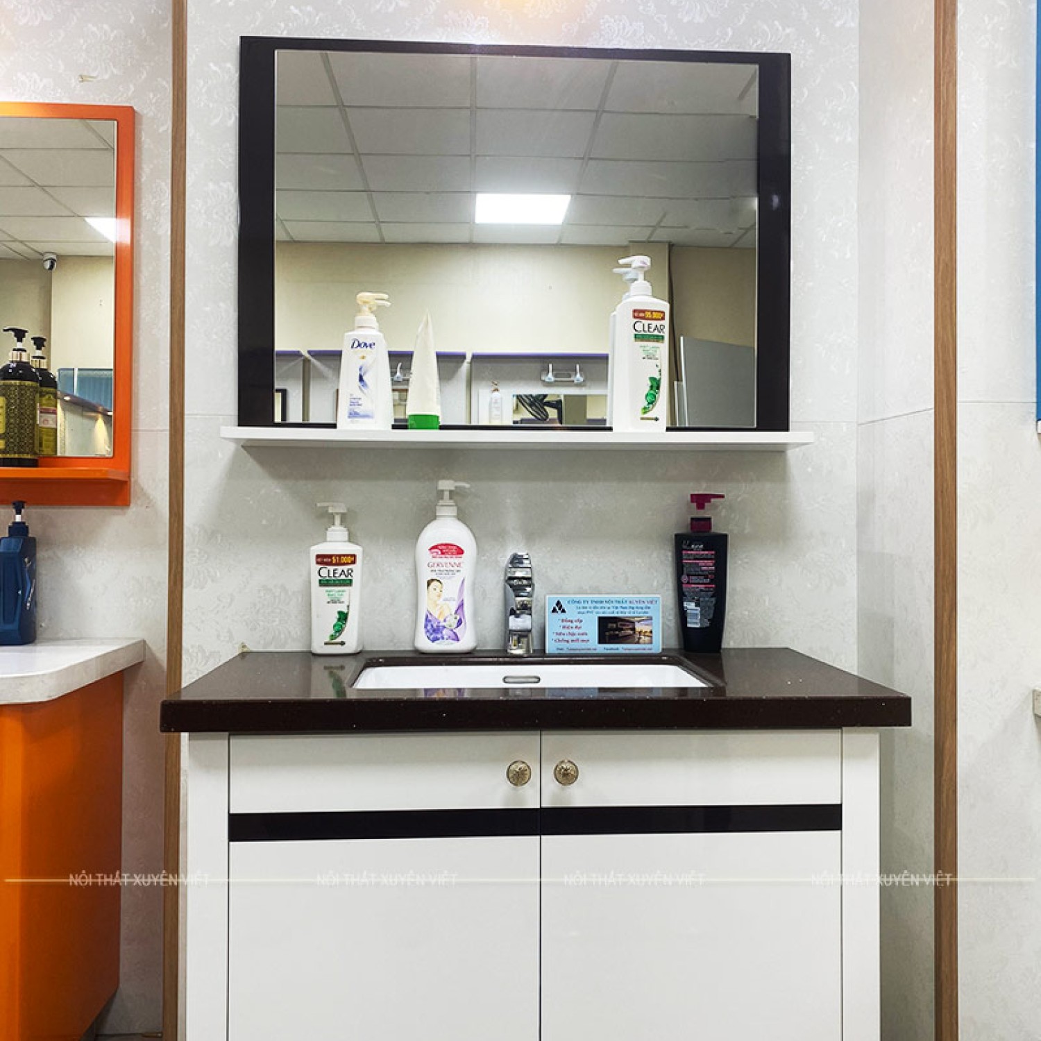 +Tủ lavabo : được thiết kế 2 cánh mở để vừa che phần xi phông xấu xí vừa để đồ được một cách gọn gàng ngăn lắp +Chậu lavabo: Chậu lavabo được đặt âm với mặt đá thạch anh nhân tạo cho bộ tủ trở nên hiện đại và tinh tế hơn +Bản lề : Toàn bộ được sử dụng gồm 4 cái bản lề inox 304 Liên hệ để đặt đóng bộ tủ lavabo có sẵn Với hơn 20 năm kinh nghiệm trong nghề sản xuất tủ chậu nhà tắm cao cấp chất lượng, Xuyên Việt hoàn toàn tự tin đem đến cho quý khách hàng những mẫu tủ lavabo đẳng cấp, hiện đại với chất liệu tốt nhất trên thị trường hiện nay. Dưới đây Tủ lavabo Xuyên Việt xin gởi tới quý khách hàng cách thức đặt tủ chậu nhà tắm tại Xuyên Việt như sau: 1. Liên hệ hoặc tới trực tiếp showroom: 176 Đường Láng, tp Hà Nội qua Hotline: 0904.471.339 (MS.Hằng)để được chuyên viên tư vấn về kích thước, báo giá chi tiết về bộ sản phẩm này. 2. Quý khách ở xa muốn đặt đóng theo mẫu tủ chậu nhà tắm theo mẫu mã và kích thước phù hợp với diện tích phòng tắm gia đình mình => Hãy kết bạn Zalo theo từng Hotline gần khu vực mình sinh sống để được chuyên viên tư vấn Xuyên Việt báo giá chi tiết, sau khi báo giá chi tiết Xuyên Việt sẽ có kỹ thuật qua nhà tư vấn và đo đạc chi tiết để lên thiết kế và sản xuất. 3. Quý khách muốn đặt đóng theo mẫu tủ chậu nhà tắm theo yêu cầu, xin vui lòng gọi qua Hotline theo từng vùng miền nơi quý khách sống (hiển thị ngay phía dưới màn hình) để được chuyên viên tư vấn chi tiết hơn về mẫu mã, kết cấu và kiểu dáng phù hợp với không gian phòng tắm gia đình mình. Xuyên Việt xin kính chúc Quý khách lựa chọn bộ tủ chậu nhà tắm ưng ý nhất cho ngôi nhà của mình – Xin chân thành cảm ơn Quý khách hàng đã tin tưởng và lựa chọn sản phẩm của công ty chúng tôi !