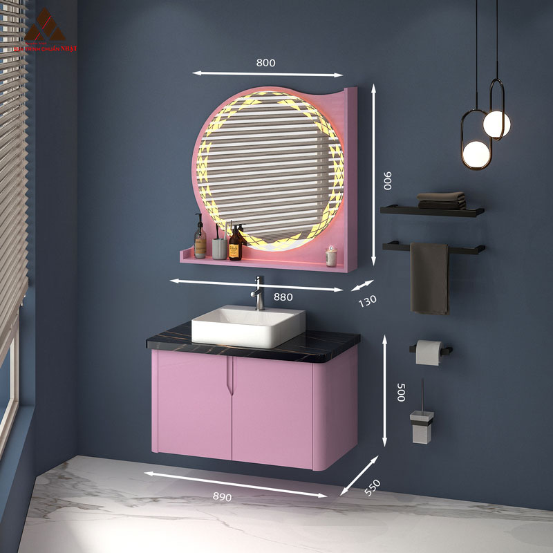 - Kích thước tủ lavabo: Dài 89cm x Cao 50cm x Sâu 55cm. Kích thước linh động đến từng cen ti mét để phù hợp với mọi không gian.